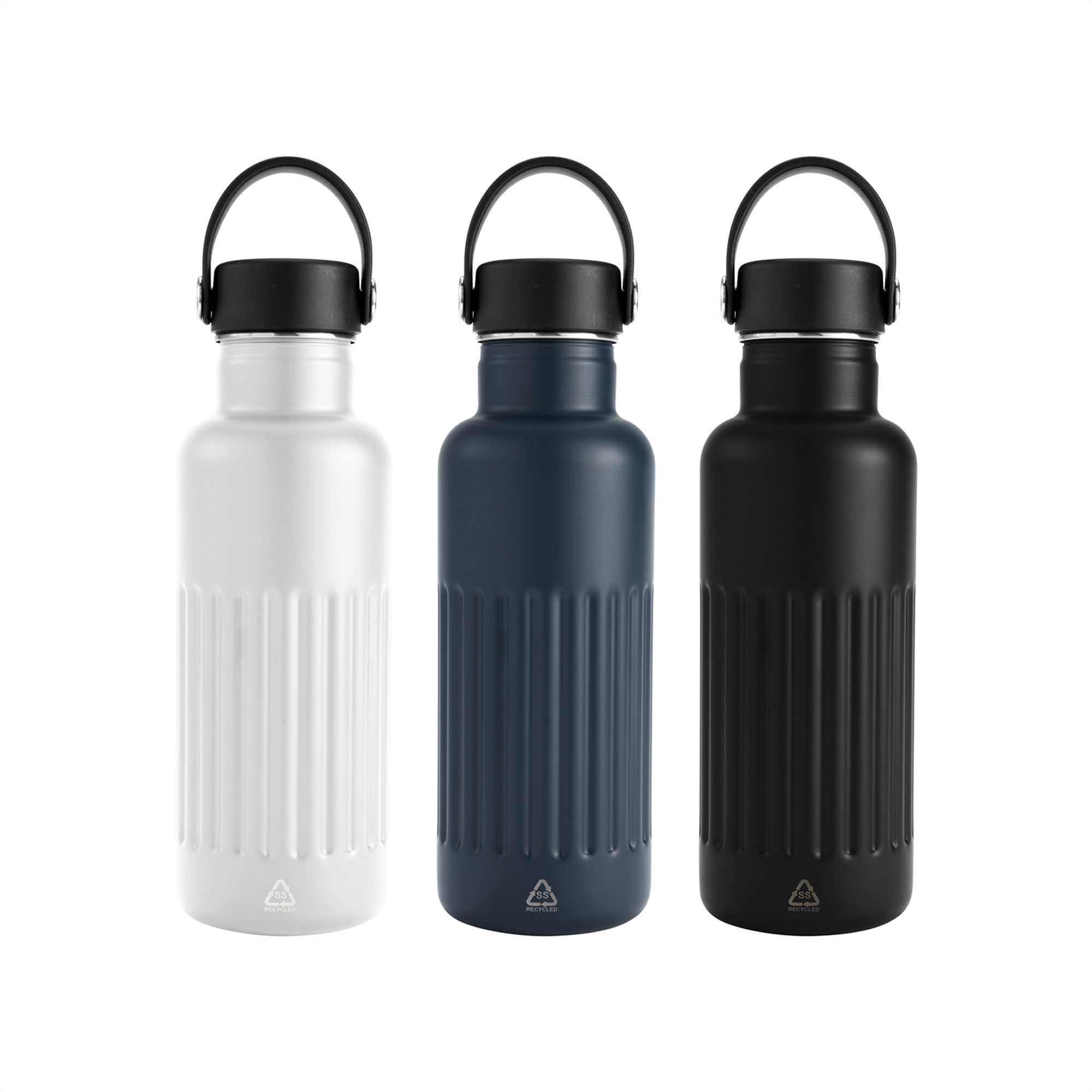 Botella doble pared, sellada al vacío. Botella con aislamiento térmico. Tecnología vacuum. Interior de acero 304 reciclado y exterior de acero 201. Tapa a rosca de polipropileno, interior plástico. Asa reforzada de silicona. Pintura acabado semi mate. Cuerpo texturado para un mejor agarre. Mantiene hasta 12 hs la temperatura de las bebidas calientes y 24 hs de las bebidas frías.